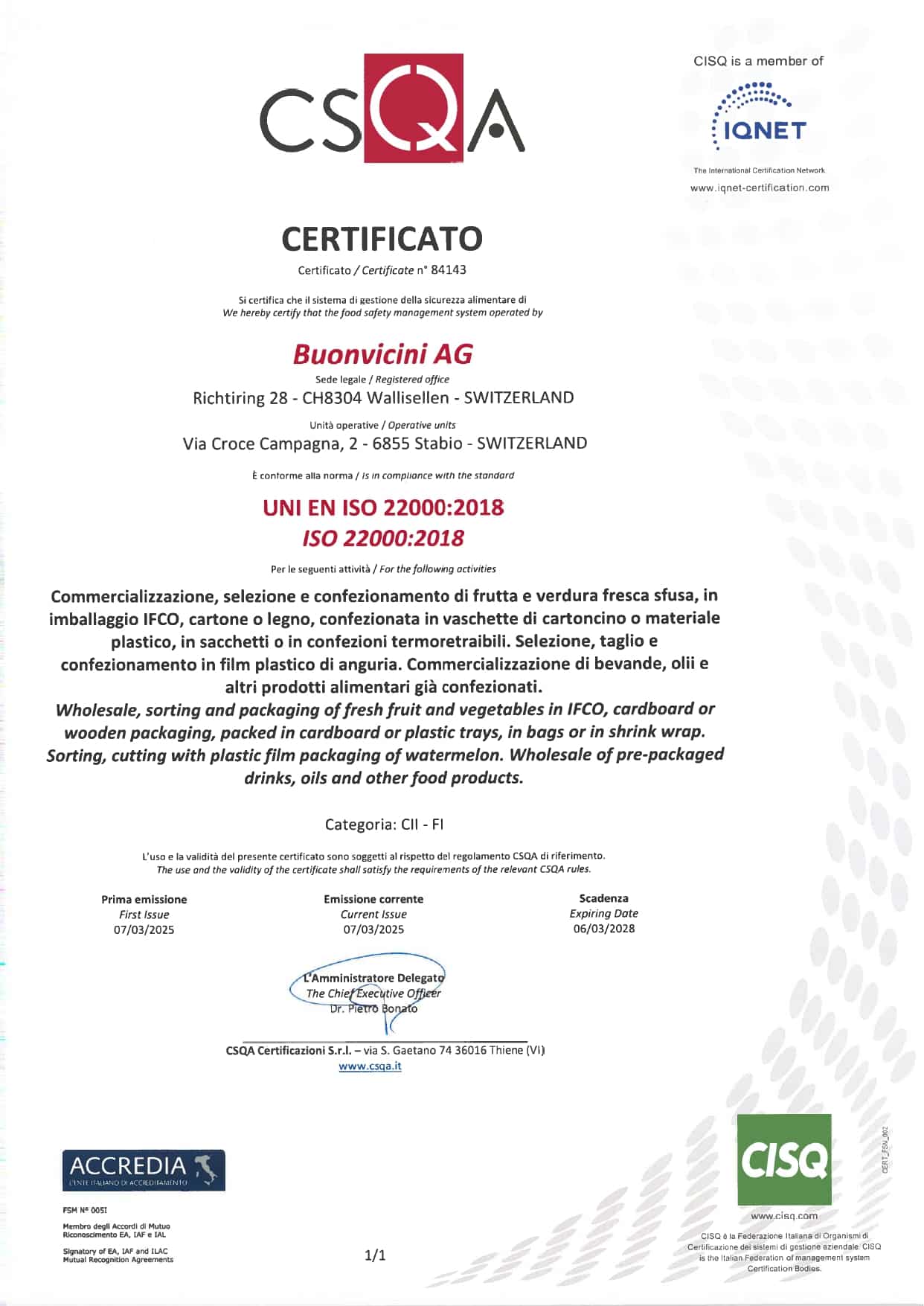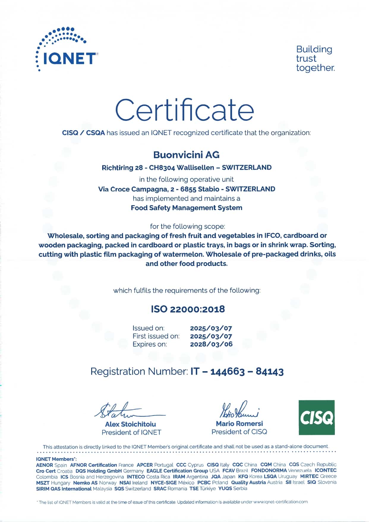 Die Buonvicini AG ist nach ISO 9001:2015, Bio Suisse, SwissGAP, IFS Broker, Demeter, Fairtrade zertifiziert.